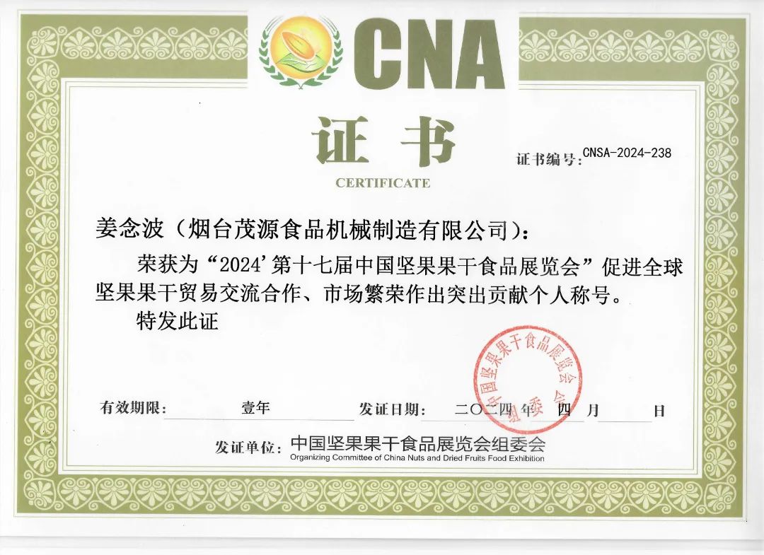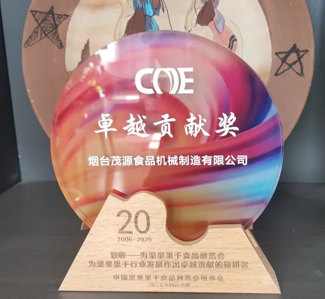 同時(shí),姜念波同志被中國堅(jiān)果果干食品展覽會(huì)組委會(huì)授予 "杰出貢獻(xiàn)獎(jiǎng)"。這份榮譽(yù)不僅是對(duì)他個(gè)人專業(yè)能力與奉獻(xiàn)精神的高度肯定,更是對(duì)其帶領(lǐng)企業(yè)推動(dòng)行業(yè)進(jìn)步的認(rèn)可。面對(duì)這份殊榮,姜念波同志表示:"這不僅是個(gè)人的榮譽(yù),更是團(tuán)隊(duì)共同努力的成果。未來,將繼續(xù)以推動(dòng)堅(jiān)果加工產(chǎn)業(yè)智能化發(fā)展為己任,與茂源機(jī)械全體同仁攜手,為行業(yè)發(fā)展貢獻(xiàn)更多力量。"茂源機(jī)械將以更高標(biāo)準(zhǔn)、更嚴(yán)要求,向著堅(jiān)果設(shè)備制造領(lǐng)域的新高峰邁進(jìn)。