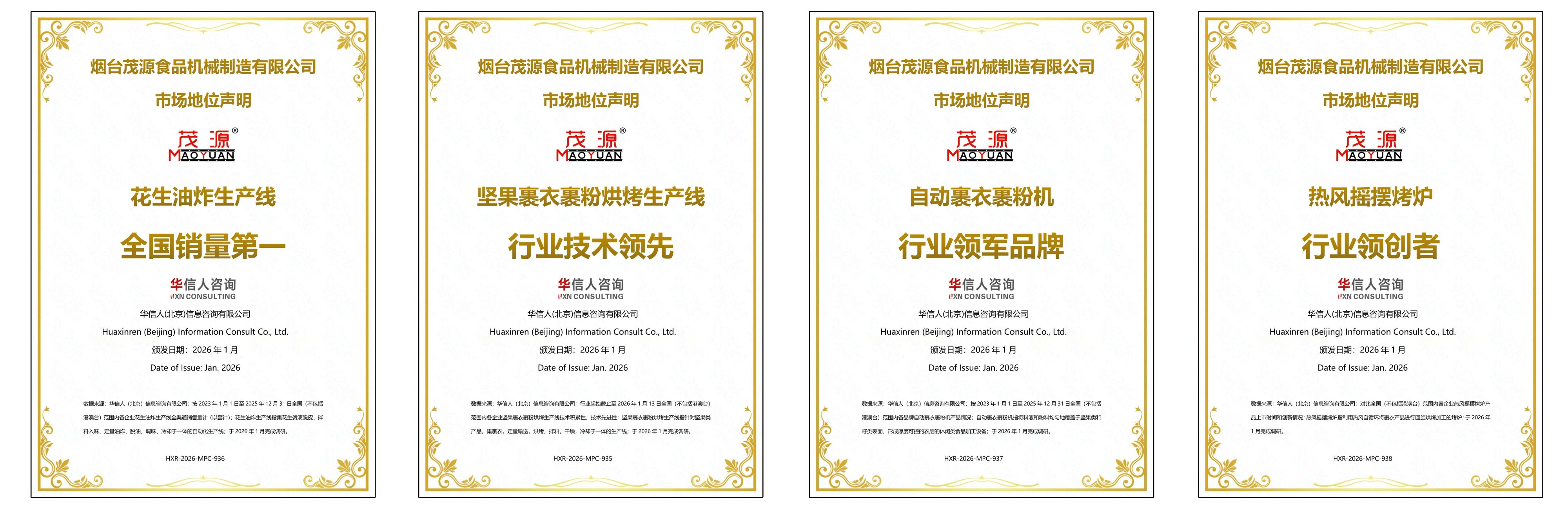 近日,煙臺茂源食品機械制造有限公司一舉斬獲由國內權威調研機構華信人(北京)信息咨詢有限公司頒發的四項市場地位聲明書。這不僅是對茂源三十載深耕行業的權威肯定,更標志著茂源在花生油炸生產線、堅果裹衣裹粉烘烤生產線、自動裹衣裹粉機以及熱風搖擺烤爐四大核心領域已確立起無可爭議的領先地位。